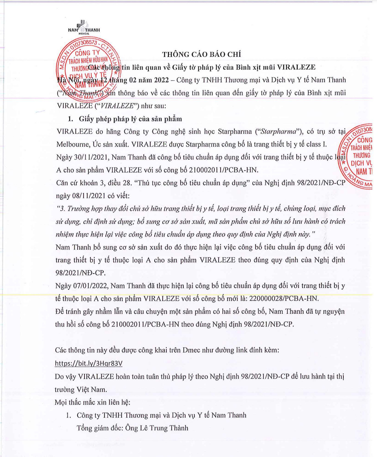 Ngày 07/01/2022, Nam Thanh đã thực hiện lại công bố tiêu chuẩn áp dụng đối với trang thiết bị y tế thuộc loại A cho sản phẩm Bình xịt mũi kháng khuẩn VIRALEZE với số công bố mới là: 220000028/PCBA-HN.